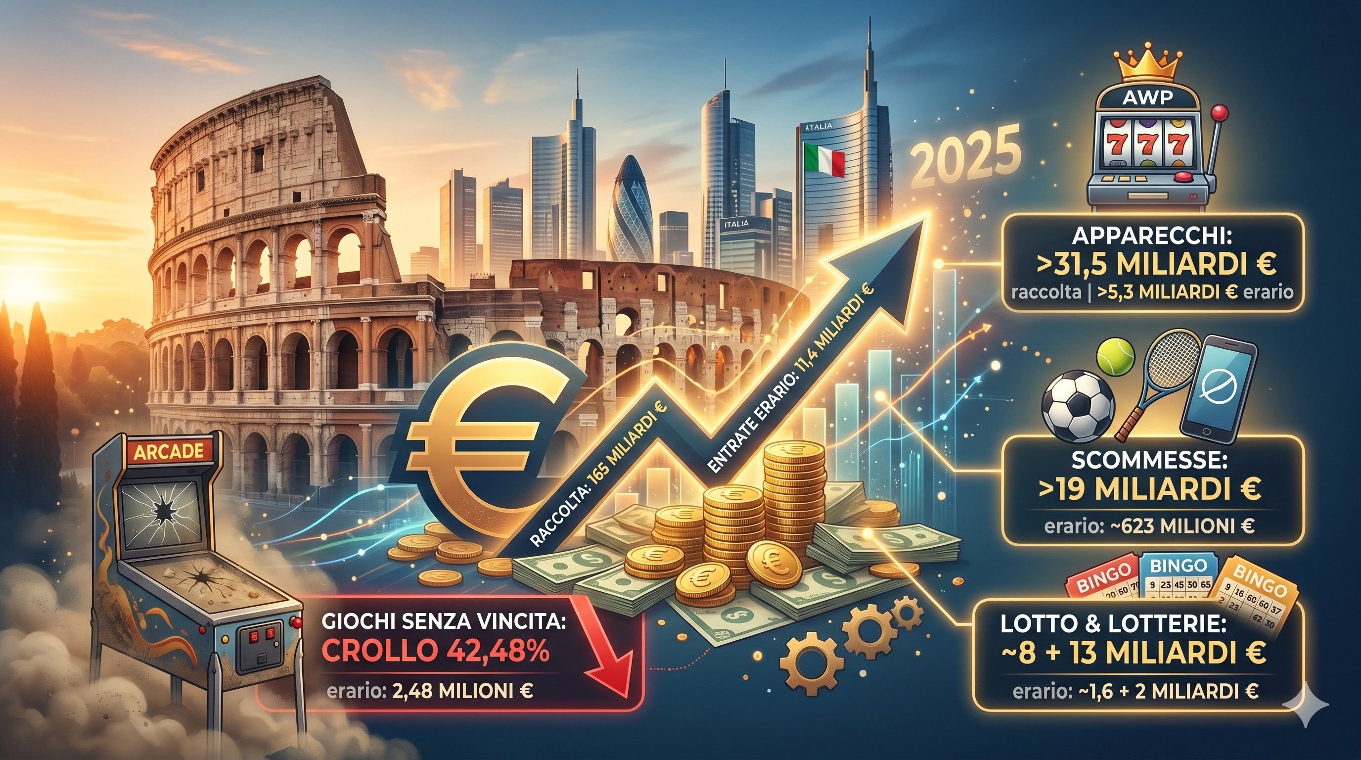 Nel 2025 il gioco pubblico italiano ha raggiunto una raccolta complessiva di 165 miliardi di euro, generando 11,4 miliardi di entrate per l'Erario. Il comparto principale resta quello degli apparecchi da intrattenimento con vincita in denaro, che da soli hanno prodotto oltre 31,5 miliardi di raccolta e più di 5,3 miliardi di gettito erariale. Le scommesse sportive hanno superato i 19 miliardi di giocato, mentre il Lotto ha toccato gli 8 miliardi con circa 1,6 miliardi di entrate fiscali.